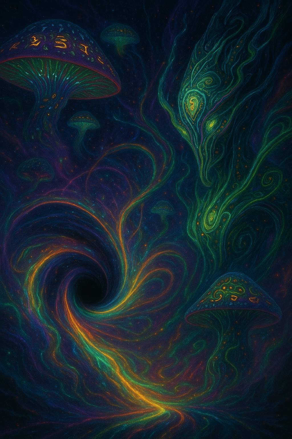 Explanation: This Atu marks the initiation of the bodymind into multisensory liberation. The Enigma represents a rupture in the continuity of the known: the wormhole or tunnel through which rapture escapes into the present. Psilocybin here is not a substance but a messenger, triggering resonance with the universe's unmeasured potential.